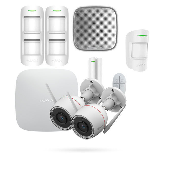 Kit Ajax de alarma con videovigilancia sin cuotas para la protección de viviendas con áreas a la intemperie que incluye detectores para exteriores y 2 cámaras wifi con visión nocturna y grabación.