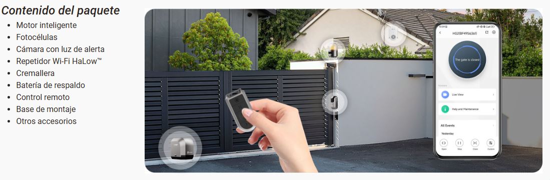 Incluye fotocélulas de seguridad que evitan cierres accidentales, luz de alarma integrada, mandos a distancia (2), cremallera, batería de respaldo y repetidor Wi‑Fi HaLow para señal estable y de largo alcance.