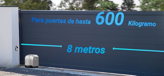 Ideal para puertas de hasta 600 kg y 8 metros, soporta lluvia y polvo, y su batería de respaldo garantiza funcionamiento incluso ante cortes de luz