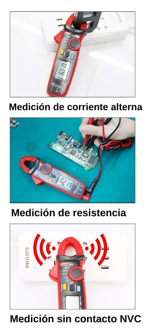 Con esta herramienta es posible medir corriente continua y alterna hasta 200A, voltaje AC/DC hasta 600V, además de parámetros como resistencia, frecuencia, capacitancia y temperatura.